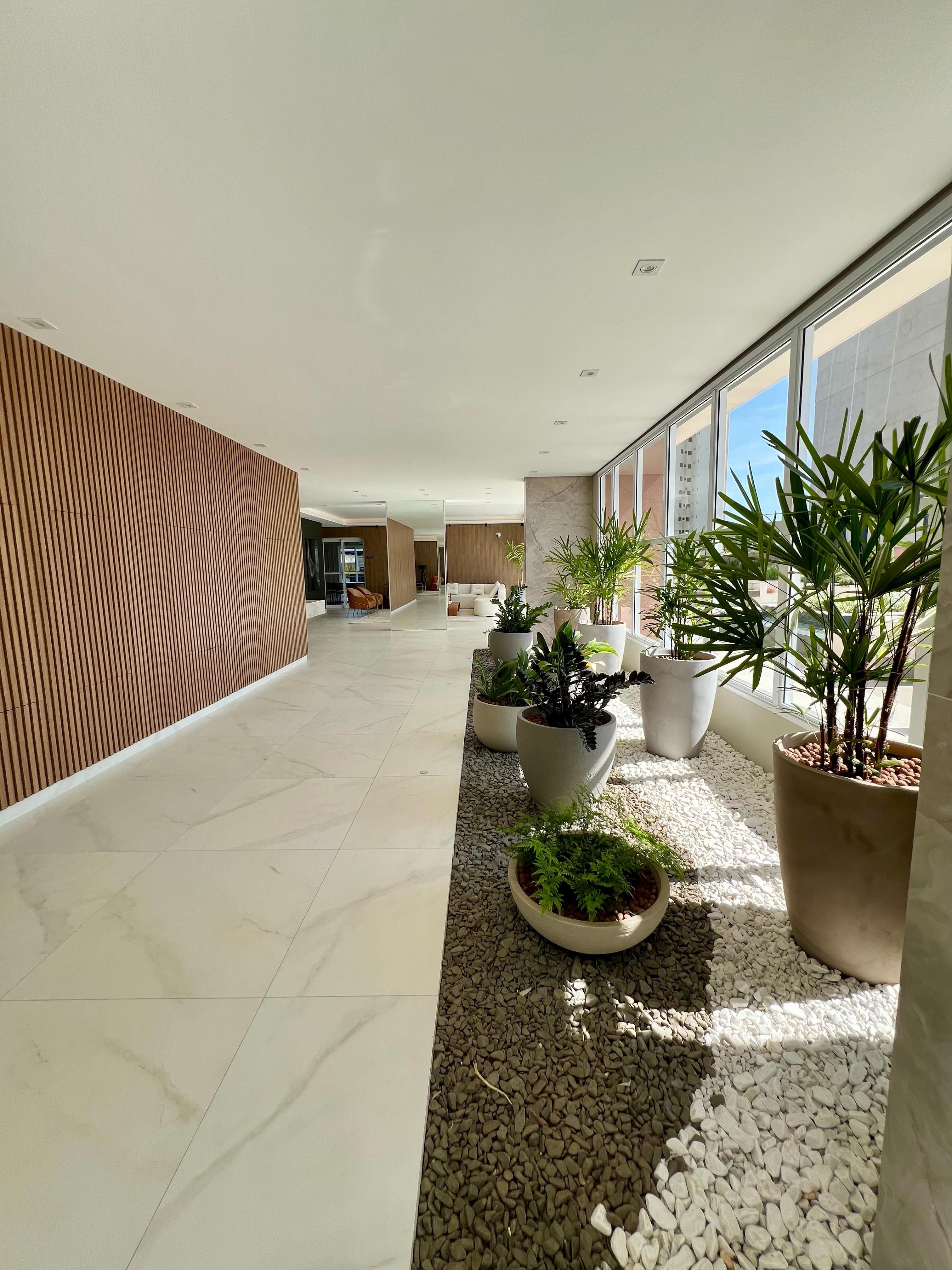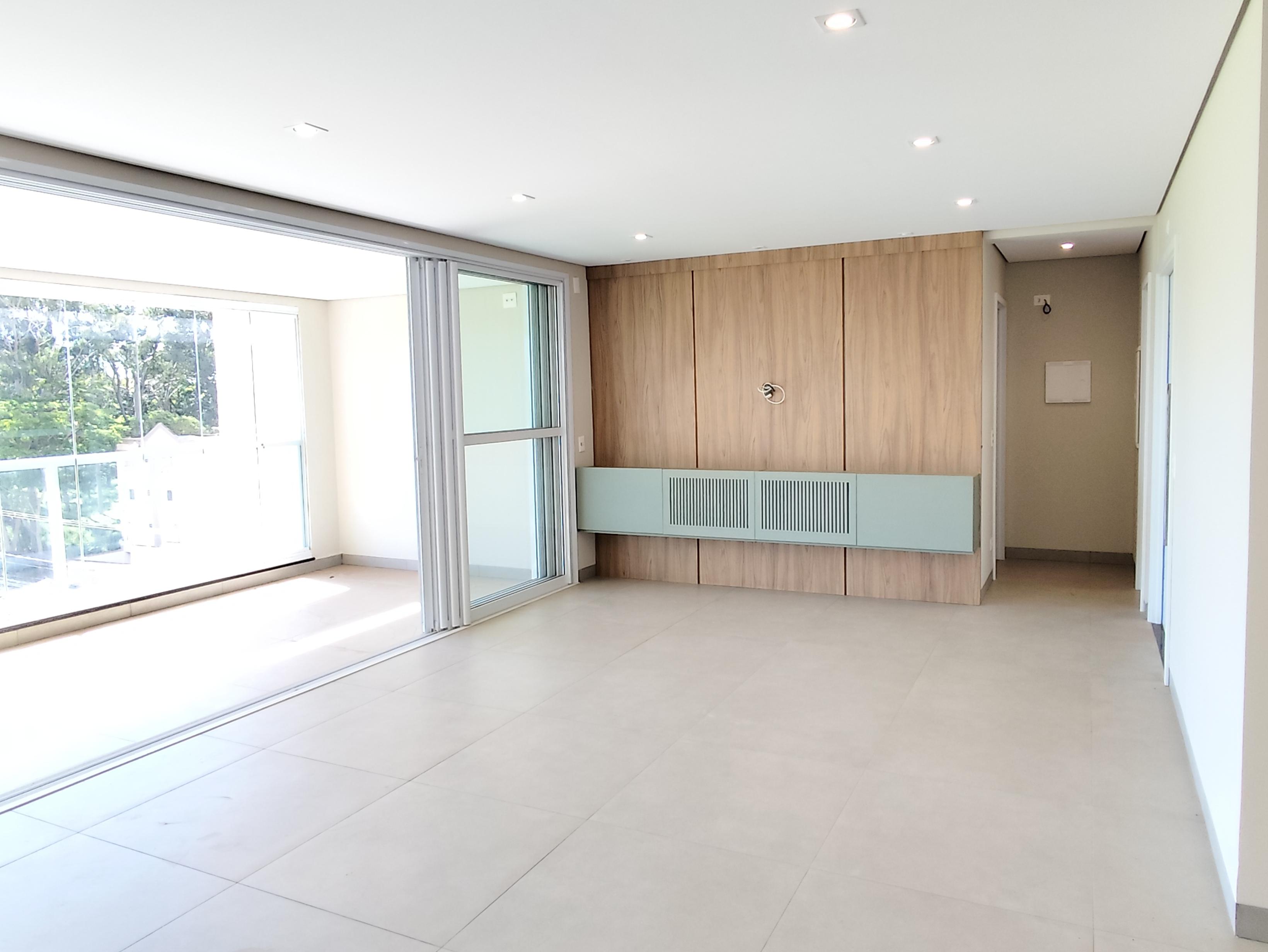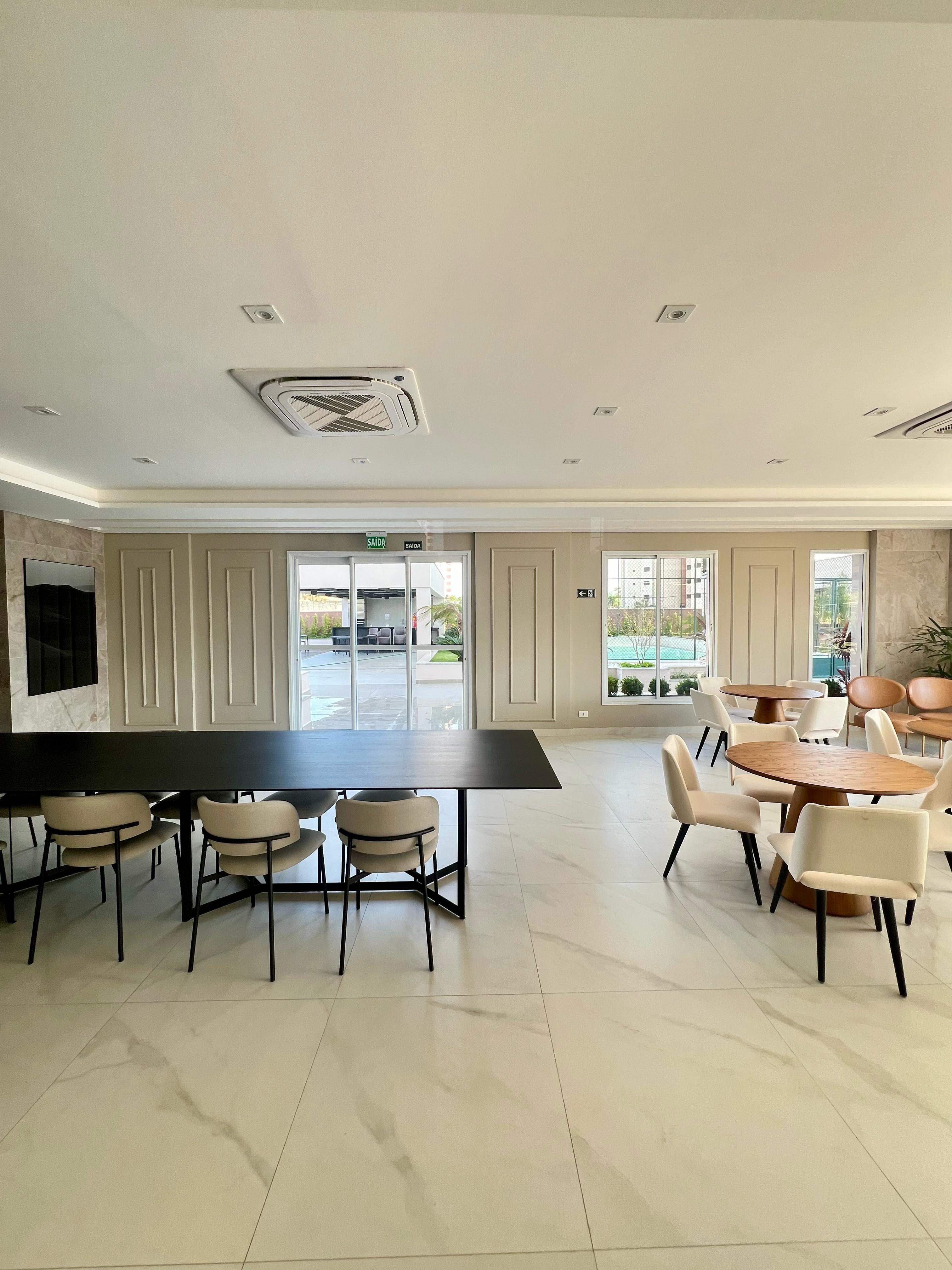 Sala ampla com painel de TV.