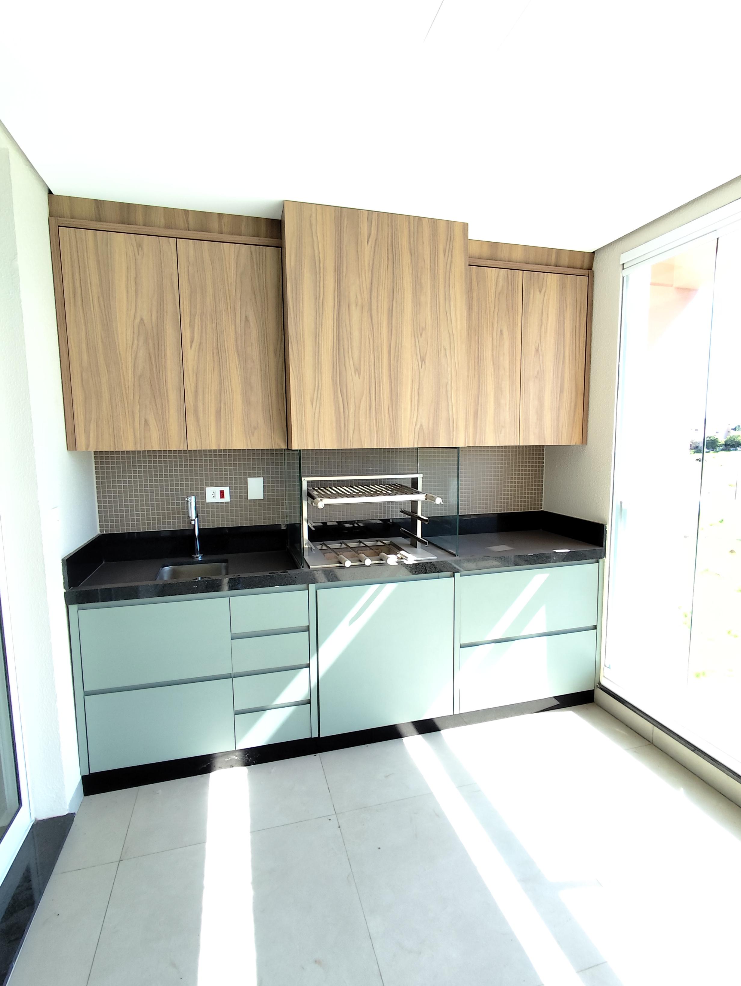 Sacada gourmet com churrasqueira, armario e fechamento em vidro.