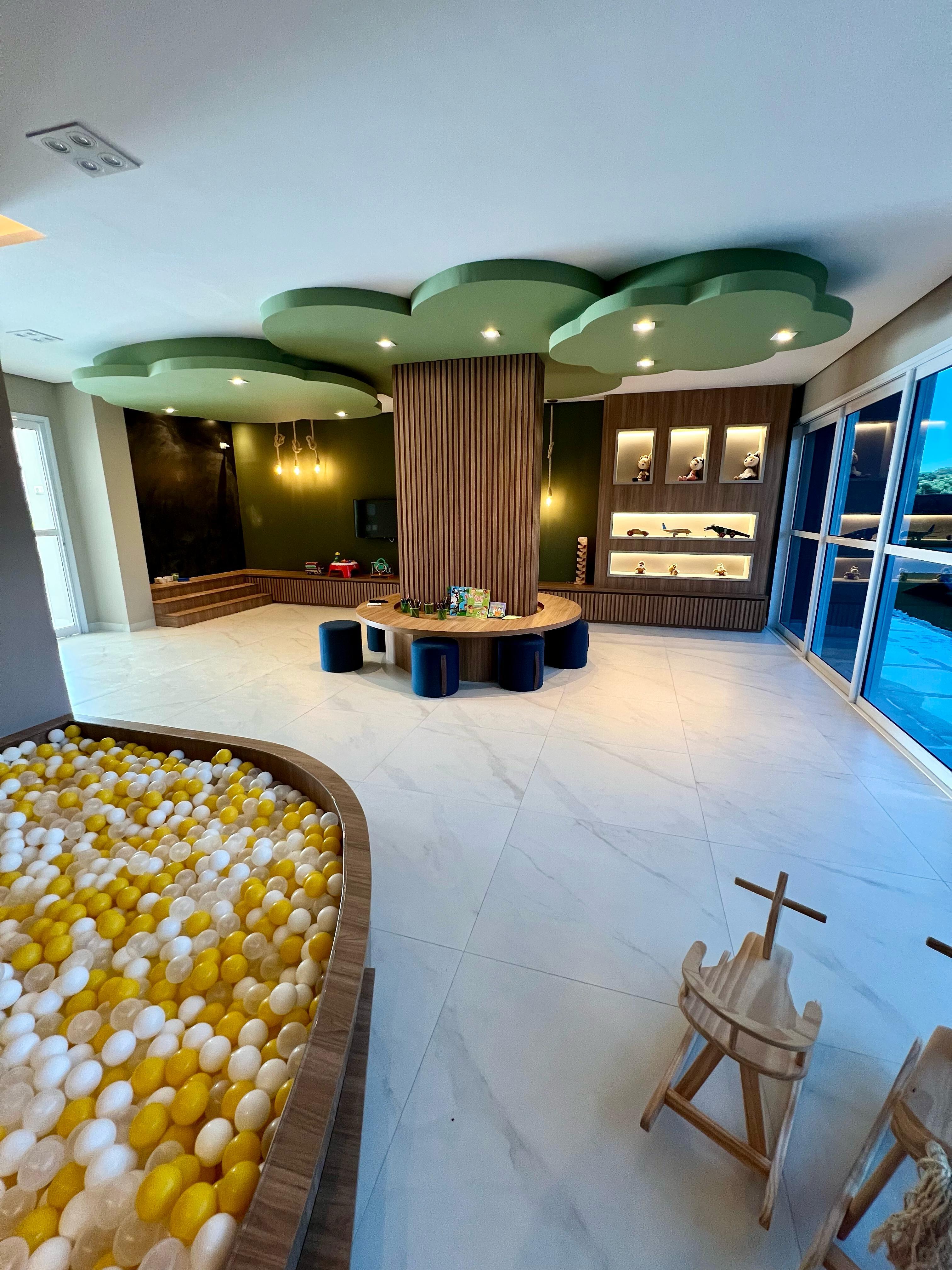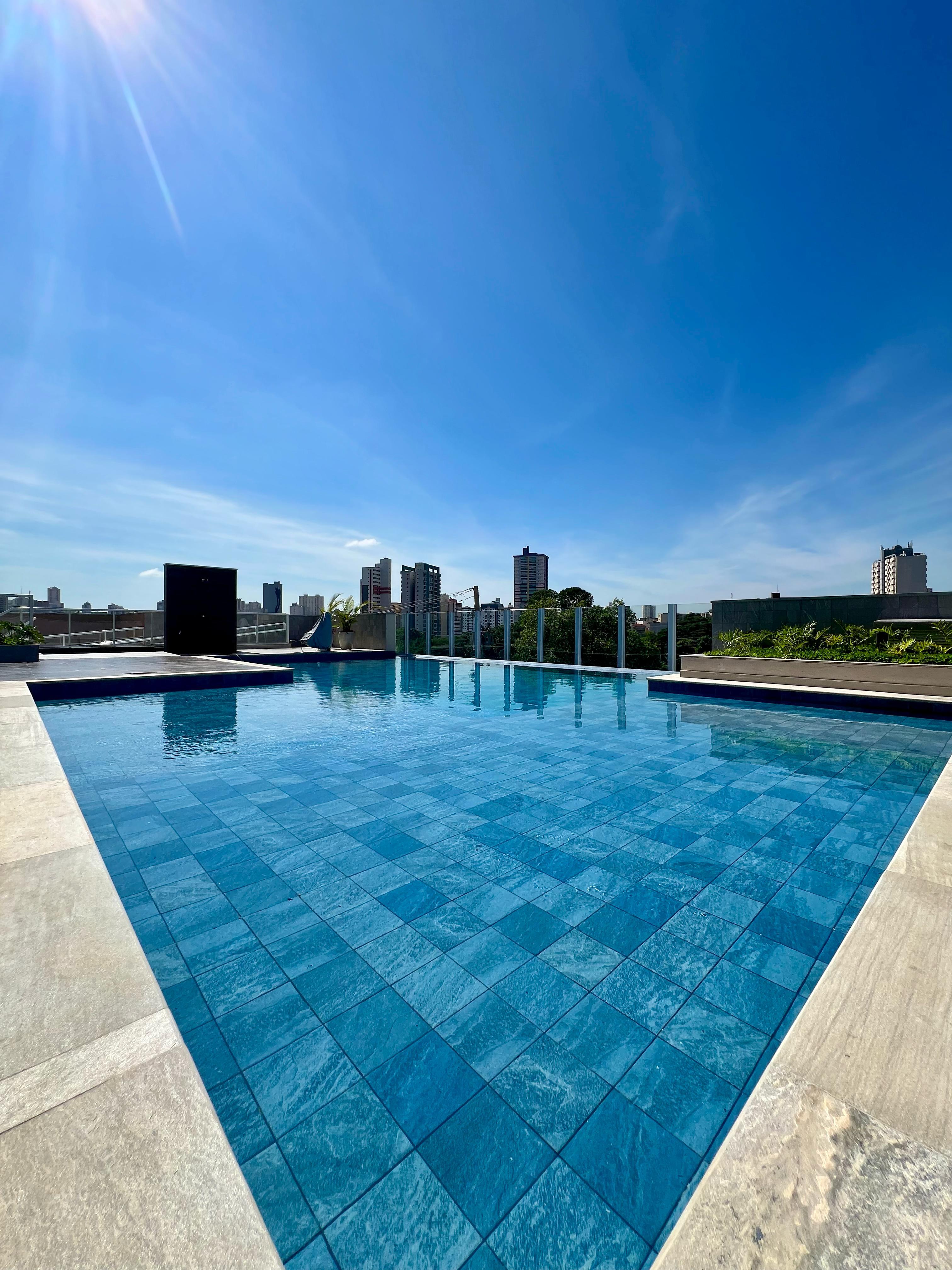 Bela área de lazer com: piscina de borda infinita, academia, salão de festas, playground e quadra poliesportiva.